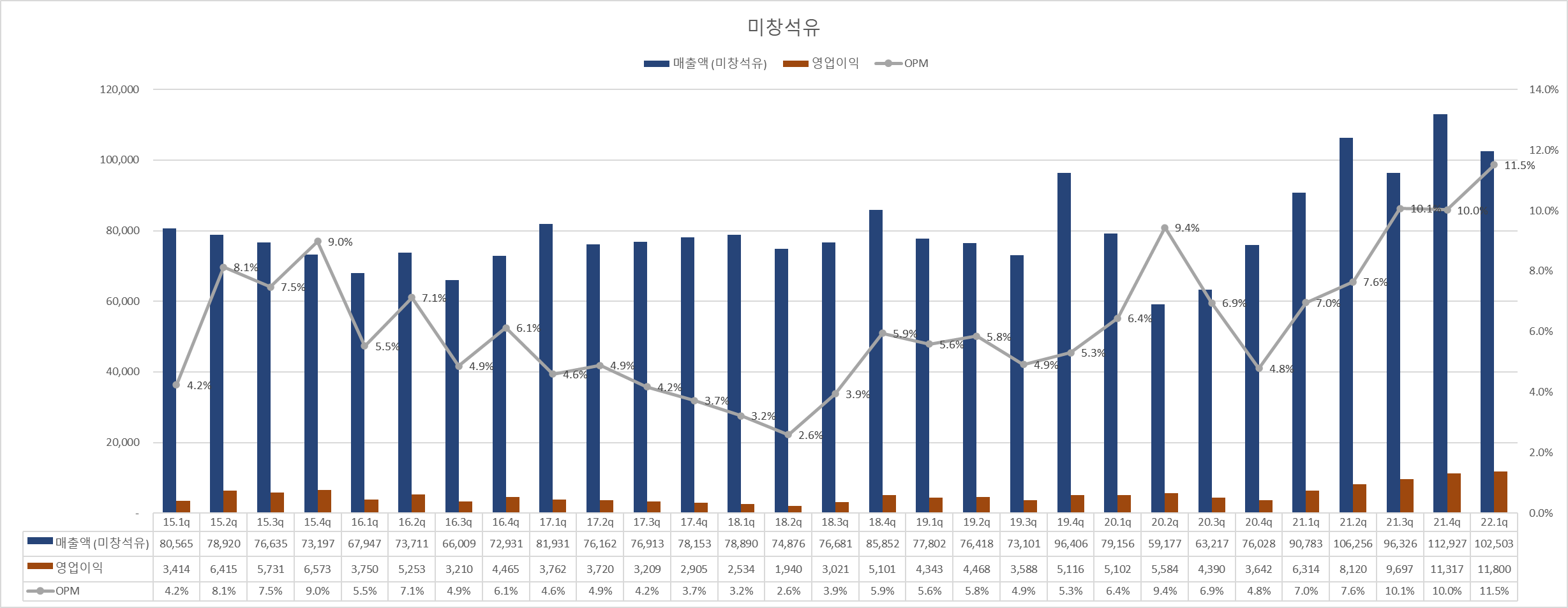 아래는 미창석유의 OP/OPM 장기 추이이며 22.1Q 역대 최대 기록을 경신.