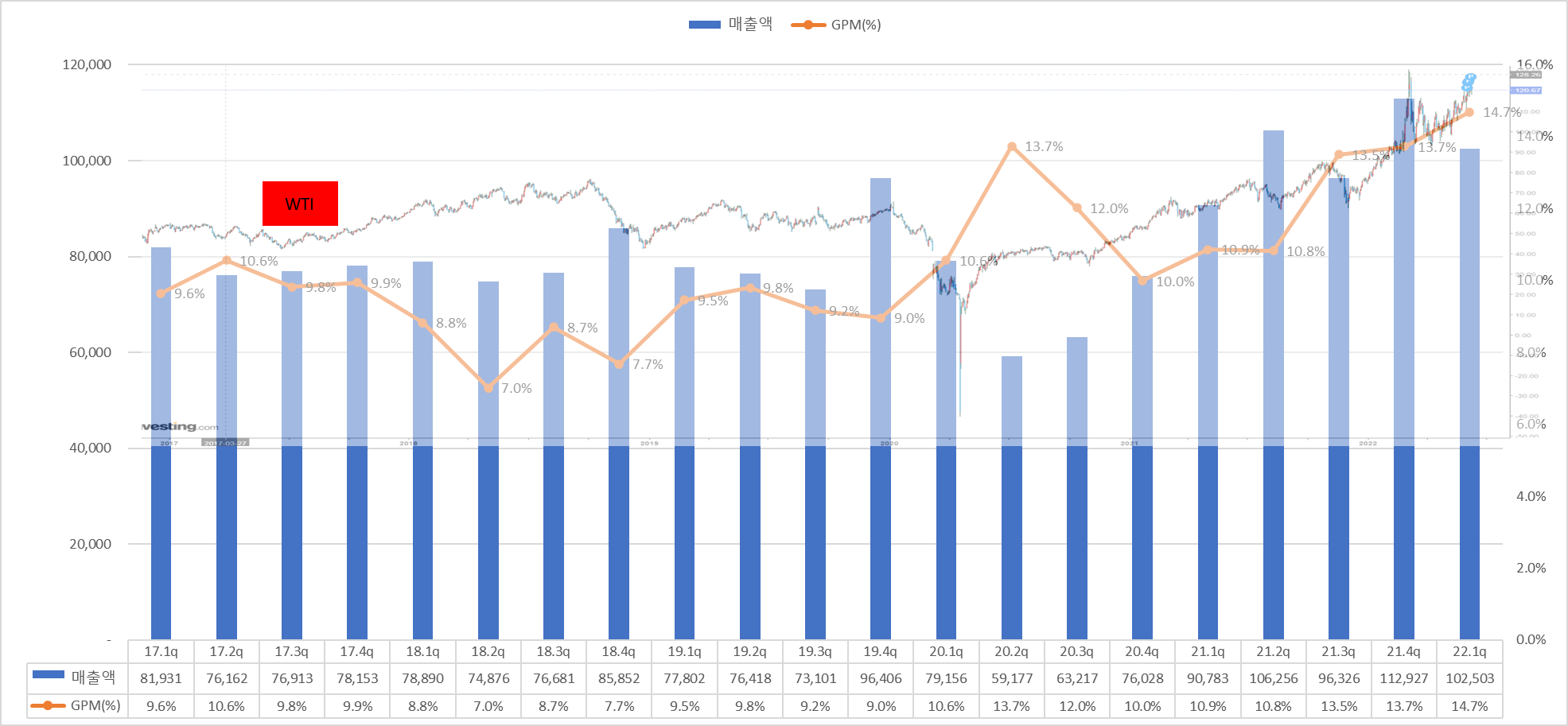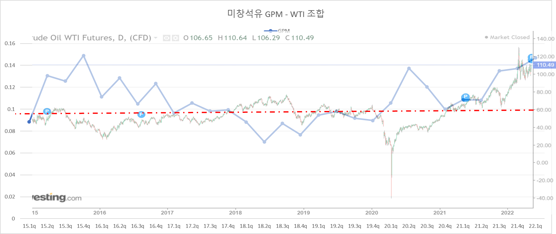 WTI가 상승함에도 불구하고 GPM 또한 상승하는 기업 구조로 변화하였으며 급기야는 유가가 120달러에 육박하는 22.1Q 역대 최고 GPM 기록.