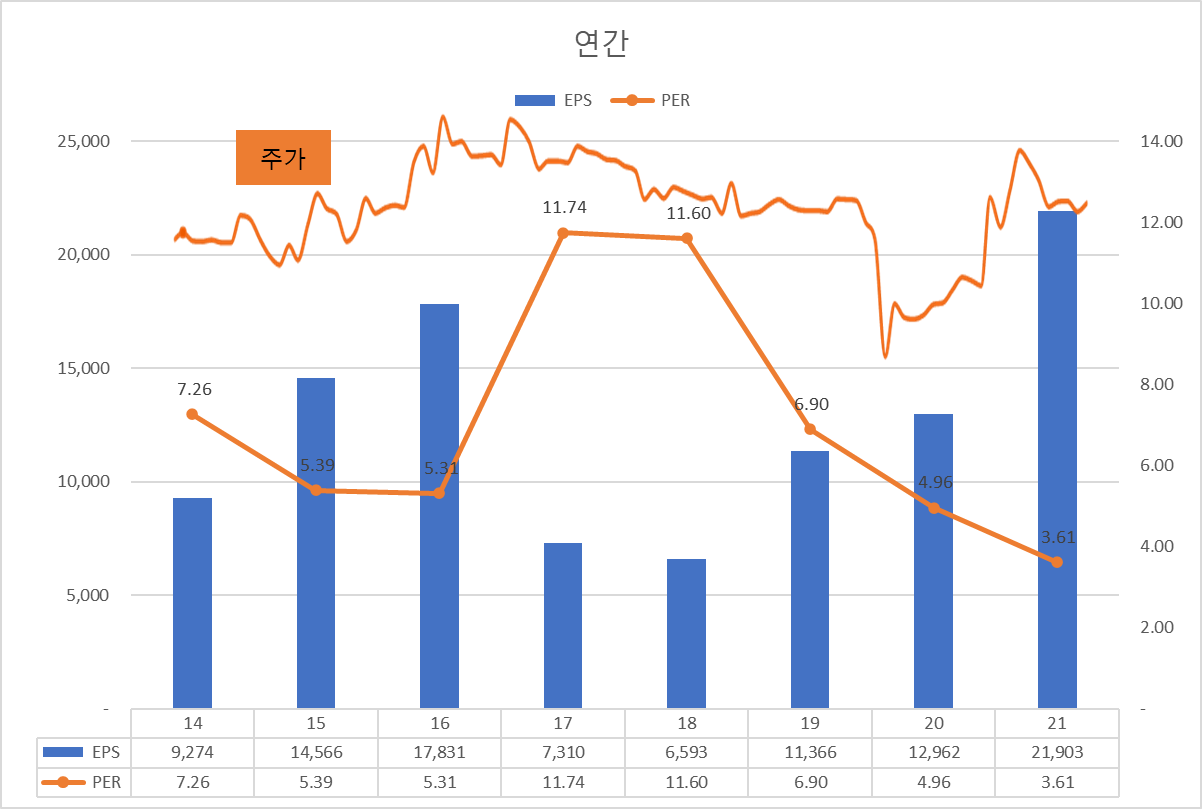 아래는 스타자동차의 14년부터의 연간 매출액/OP 추이이며 21년 역대 최대 매출액/OP 기록.