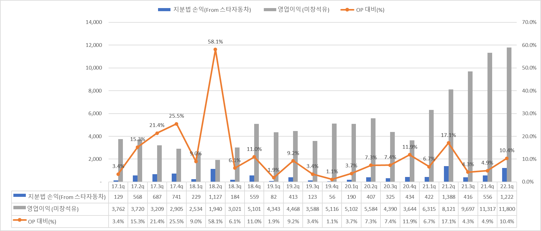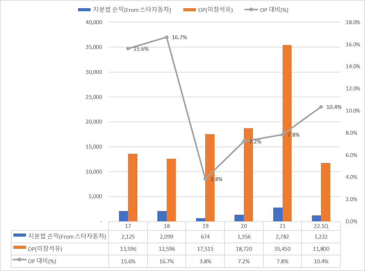 미창석유의 OP는 22.1Q 역대 최대인데 OP 대비 지분법 손익은 10%대까지 상승.