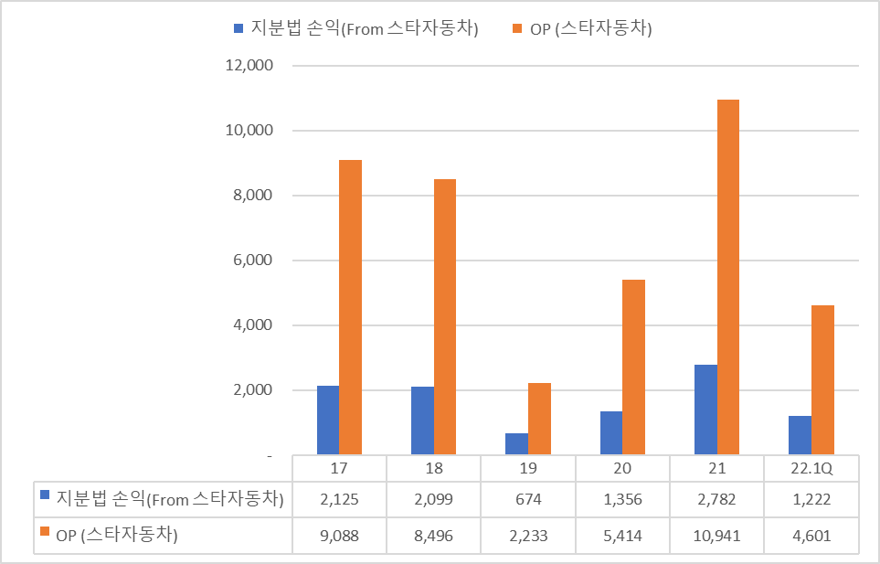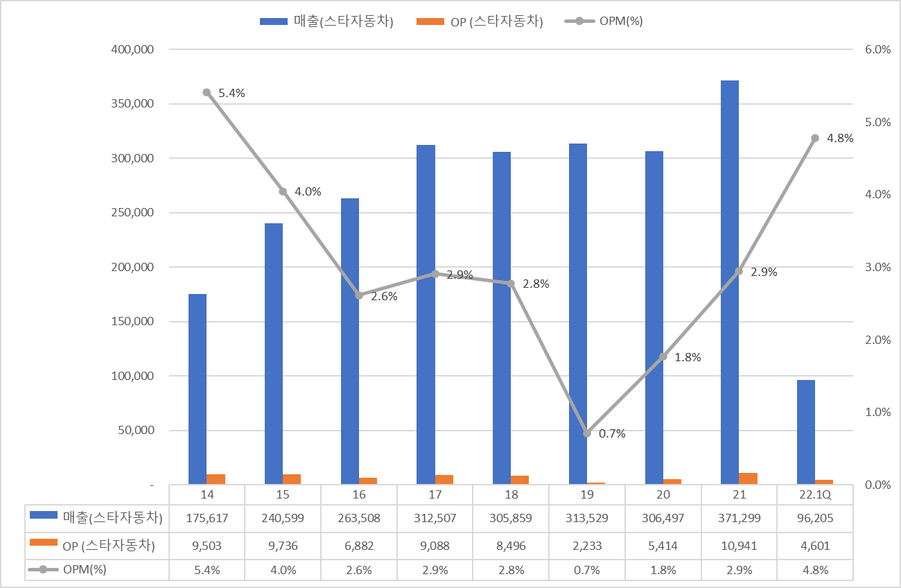 스타자동차의 OP는 21년 역대 최대. 이 추세는 22.1Q에도 지속 중.