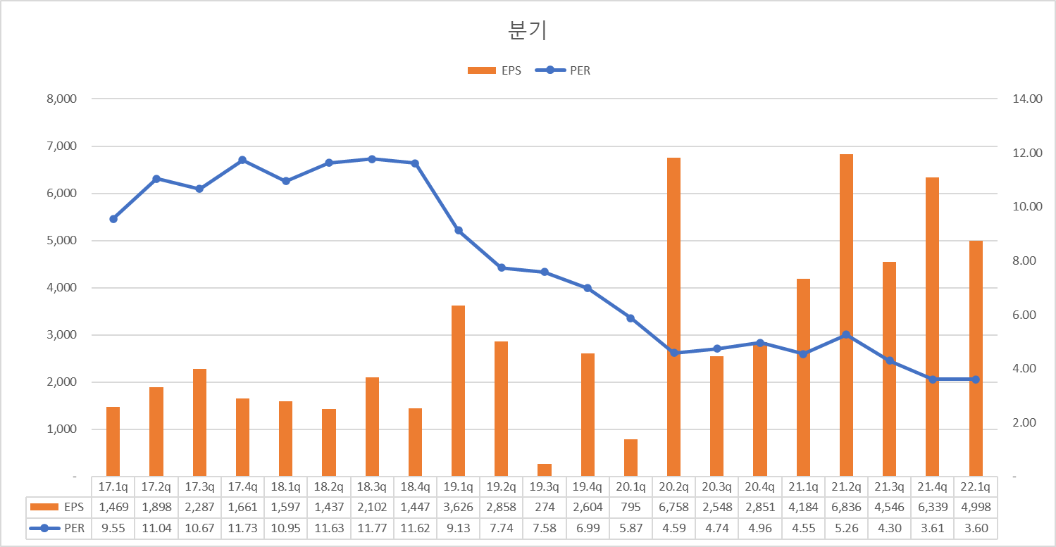 아래는 미창석유의 분기별 EPS/PER 추이.