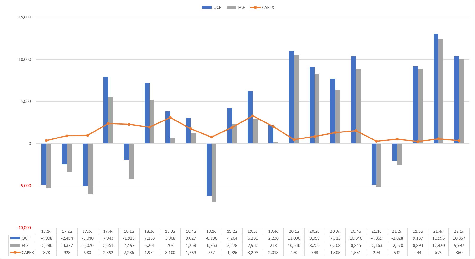 그러나 장기간 이어져 온 flat 한 매출액 성장은 (21년 이전) 아마도 추가적인 시설투자를 주저하게 만들 것임은 쉽게 추론 가능함.