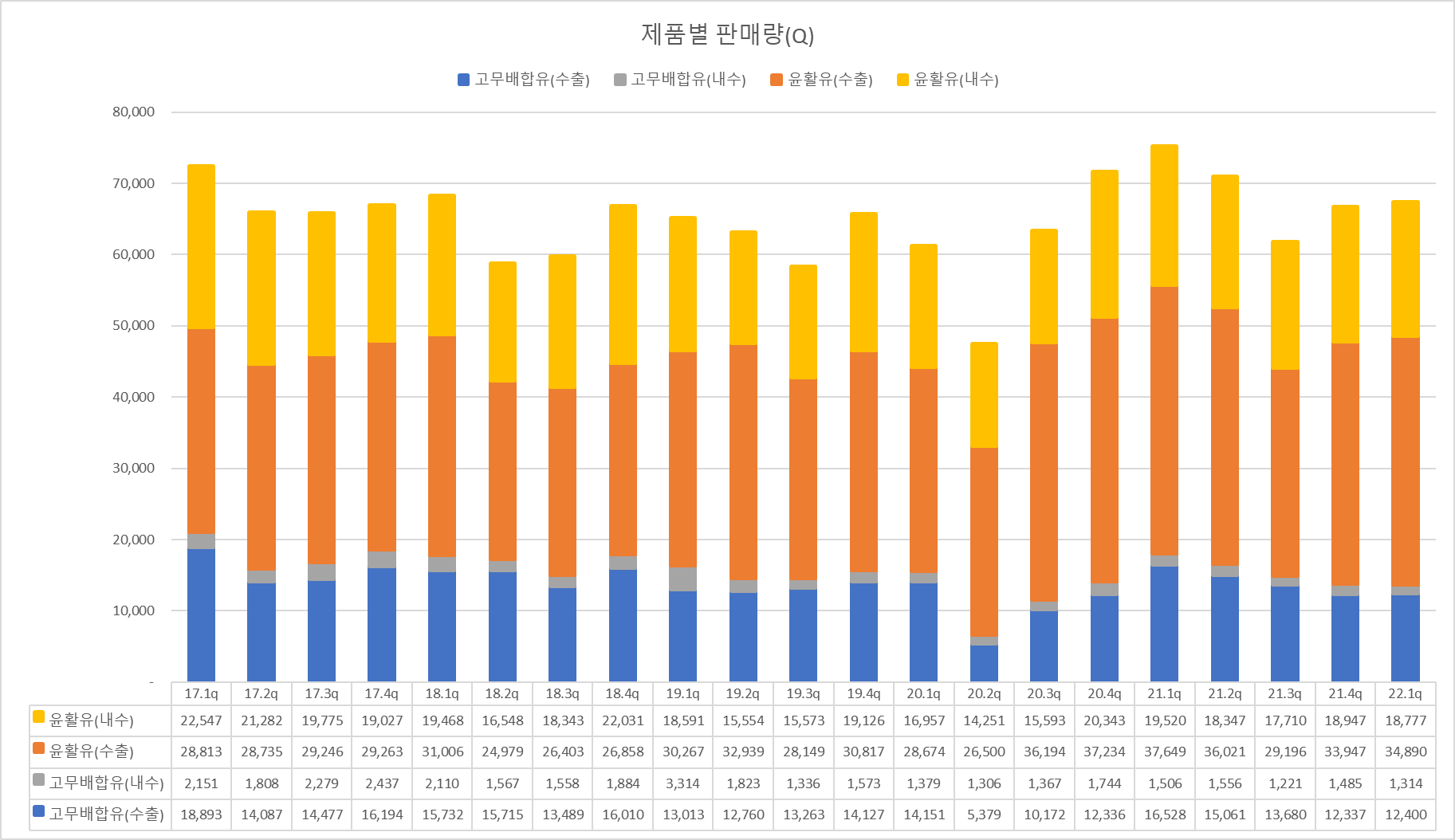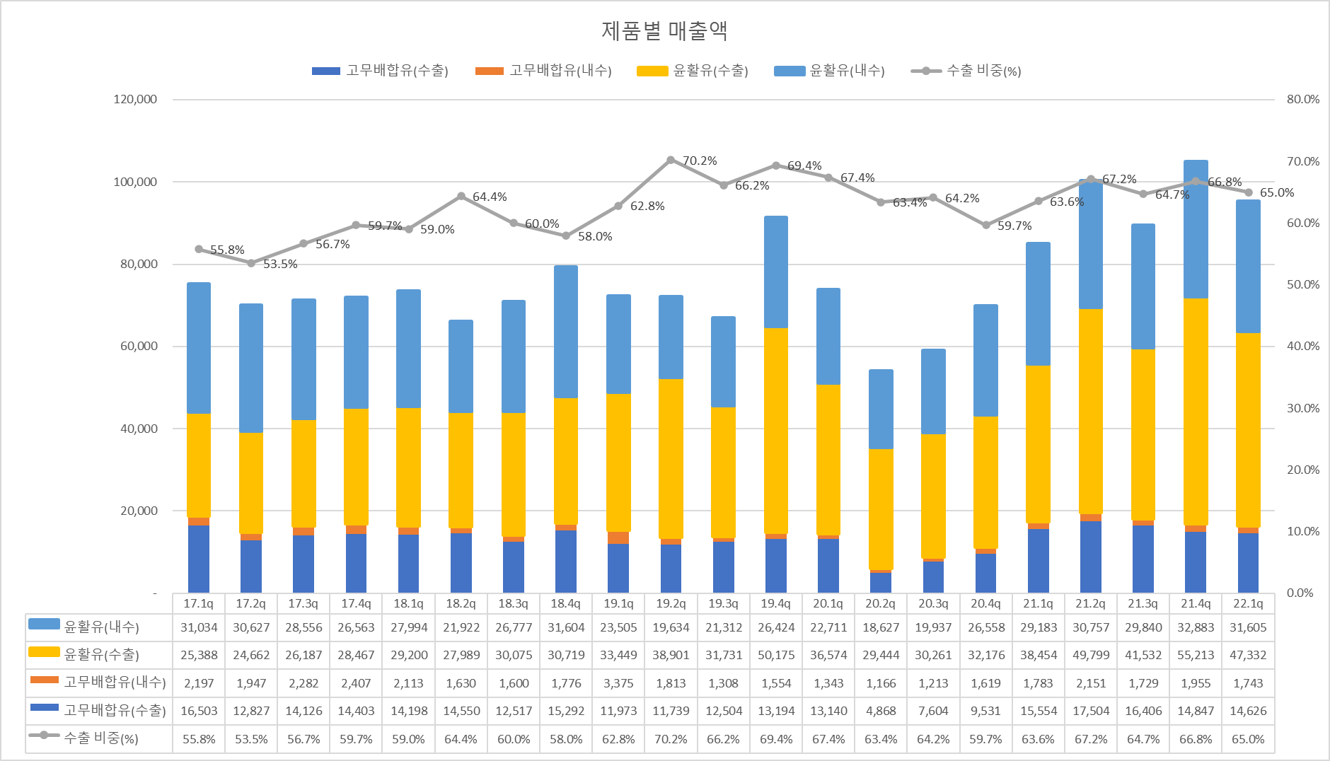 아래는 미창석유의 제품별 매출액 구조이며 수출 비중은 65% 대.