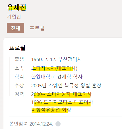스타자동차는 아래와 같은 지분율을 가지고 있으며 여기서 외 3인(49%)이 유재진 대표이사 등의 지분으로 추론 됩니다.