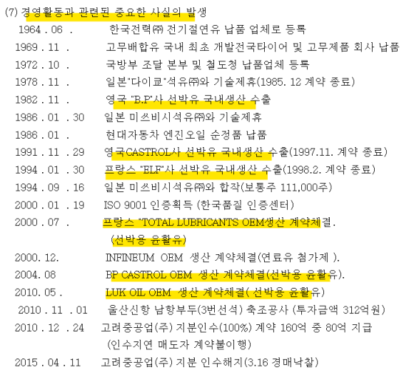 아래는 미창석유의 경영활동과 관련된 중요한 사실 list.