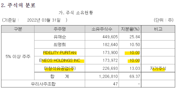 특이 사항은 일본 최대 오일 기업인 ENEOS HOLDINGS의 10% 지분율.