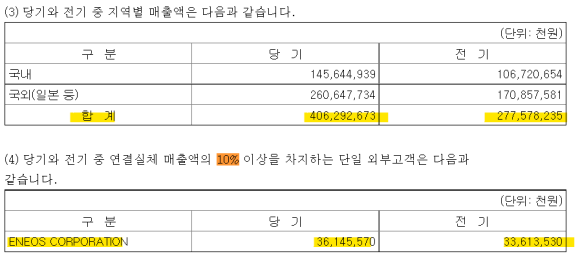 또한 매출액의 10% 이상인 최대 고객 또한 일본 ENEOS임.