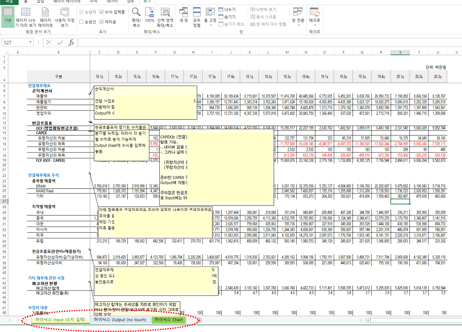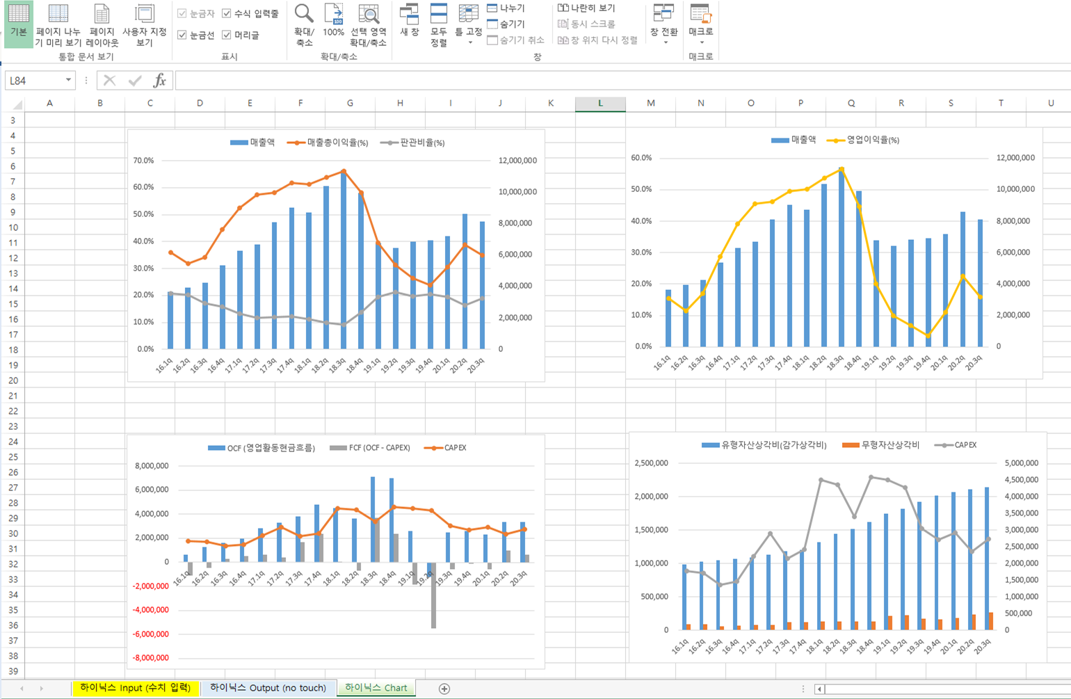 스스로 5년간 20개의 분기보고서 내용을 일일이 체크할 수 밖에 없도록 엑셀 도표를 만들어 놨습니다.