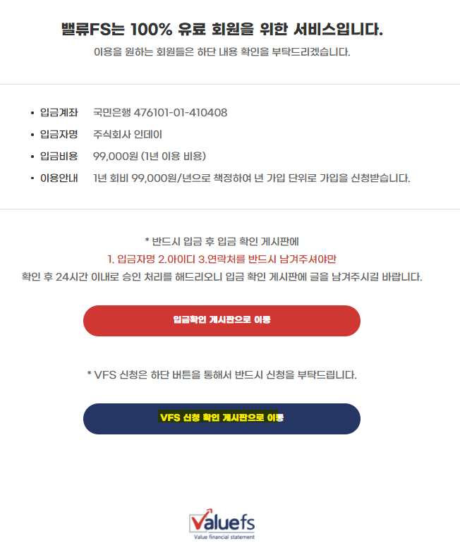 밸류fs 회원 가입을 하신 후 아래와 같이 "VFS 신청 확인 게시판으로 이동" 클릭 후 신청.
