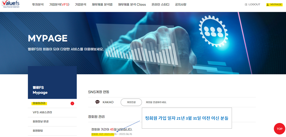 참고로 아래와 같이 Mypage에 들어 가시면 남은 일자 및 가입 일자를 확인 가능하십니다.
